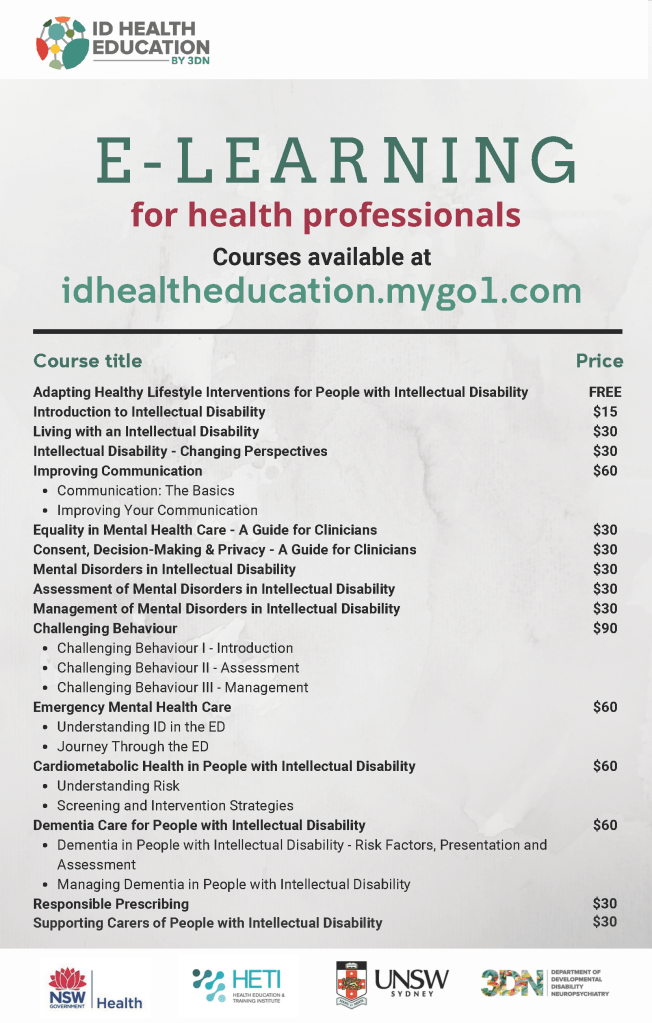In July 2017, The Department of Developmental Disability Neuropsychiatry (3DN) launched a new e-Learning resource for health and mental health professionals on intellectual disability mental health. These courses allow health and mental health professionals to learn about mental health and intellectual disability at their own pace. These courses may also be useful for students and other professionals who want to learn more about intellectual disability and health.