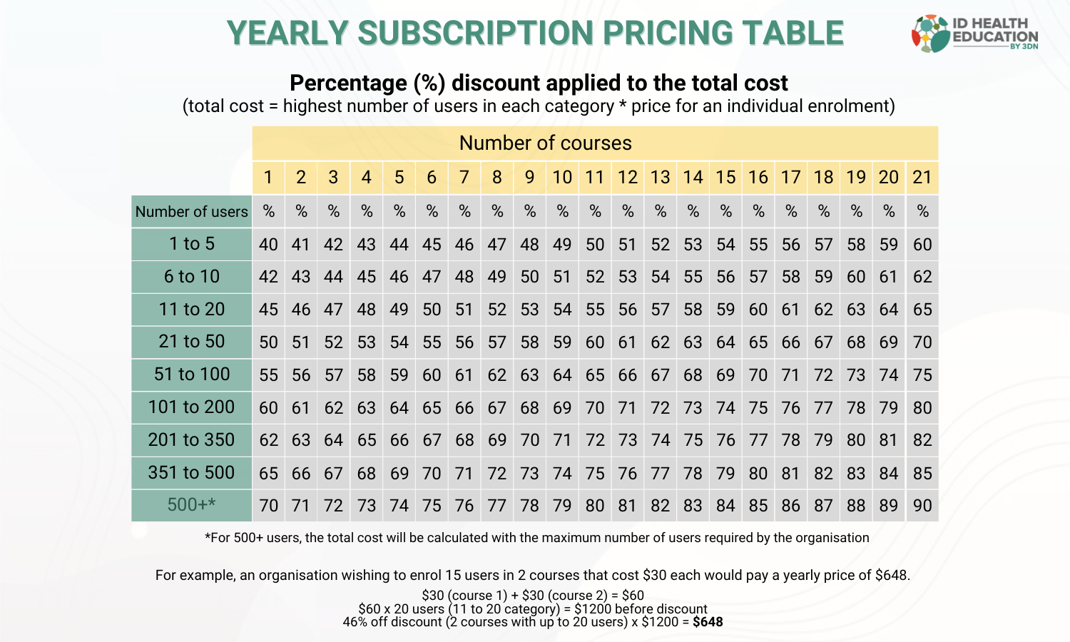 As our courses are not all priced the same, subscription costs can be calculated by using the pricing table below and the individual course prices on these pages: